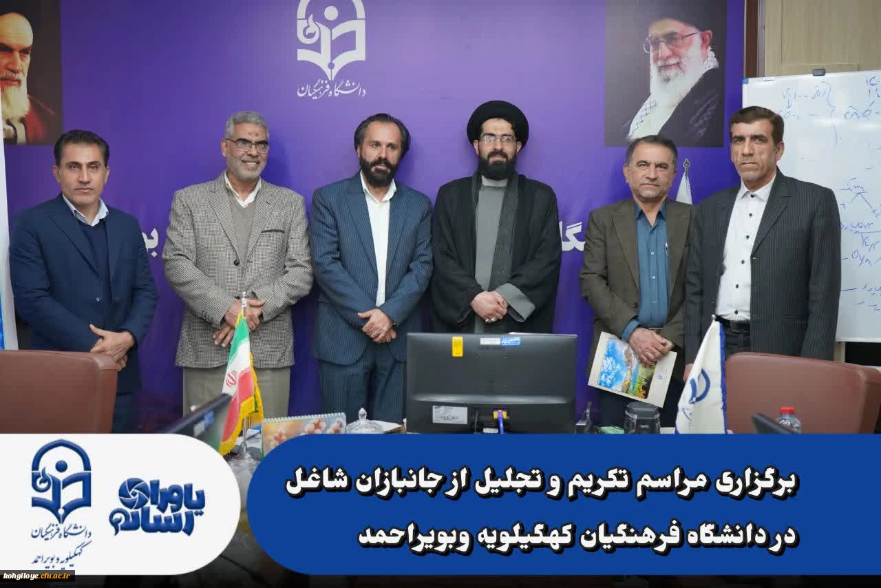 به گزارش روابط عمومی دانشگاه فرهنگیان استان کهگیلویه و بویراحمد، همزمان با اعیاد شعبانیه و به مناسبت سالروز ولادت بزرگ پرچمدار دشت نینوا، حضرت ابوالفضل (علیه السلام) و روز جانباز، از 2 نفر از جانبازان سرافراز شاغل در دانشگاه فرهنگیان استان کهگیلویهوبویراحمد تجلیل شد. در این مراسم که با حضور دکتر حسین صمصامی نماینده محترم مجلس شورای اسلامی و عضو هیأت علمی دانشگاه شهید بهشتی، سید صاحب موسوی سرپرست دانشگاه فرهنگیان استان کهگیلویهوبویراحمد، حجت الاسلام و المسلمین سید علی اصغر حسینی و جمعی از اساتید محترم هیأت علمی و کارکنان دانشگاه برگزار شد، ضمن گرامیداشت یاد و خاطره شهدای ۸ سال دفاع مقدس و رشادتهای جانبازان و ایثارگران، از آقای دکتر سید یوسف رسولی و آقای دکتر سیدمحمد دهناد با اهدا لوح تقدیر و هدیه تجلیل شد.