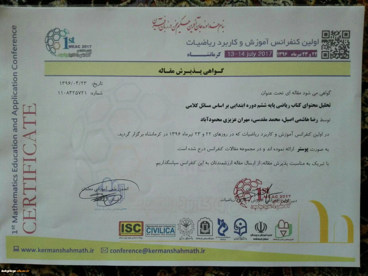 در اولین کنفرانس آموزش و کاربرد ریاضیات در کرمانشاه ارائه شد: ارائه مقاله دو دانشجوی پردیس شهید ایزدپناه با موضوع تحلیل محتوای ریاضی پایه ششم ابتدایی 2