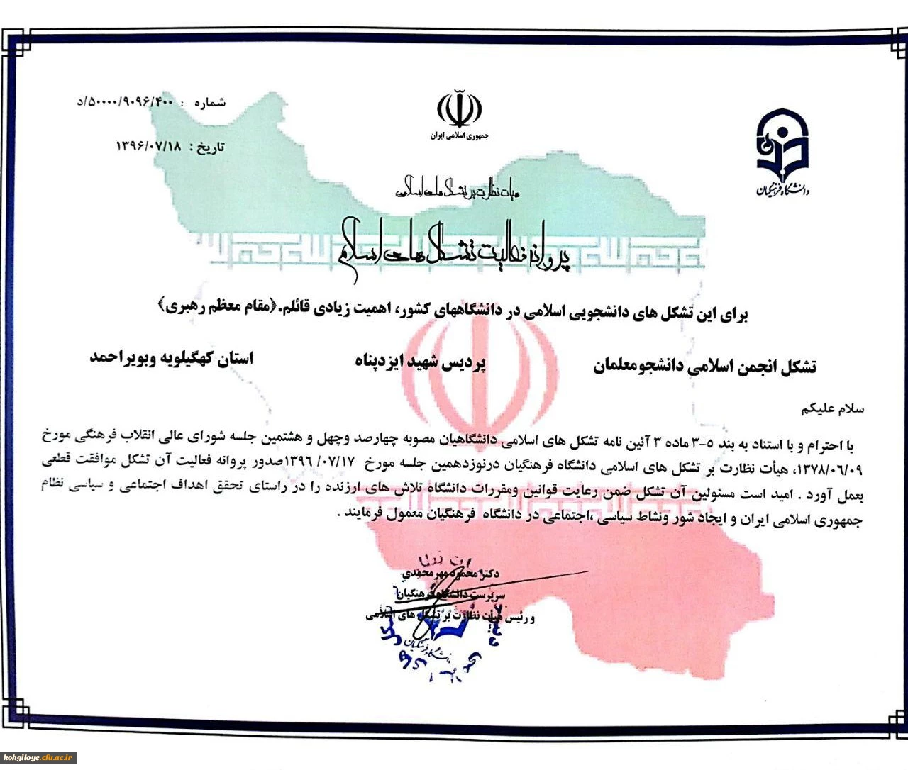 امتیاز دهید : پروانه فعالیت تشکل انجمن اسلامی پردیس شهید ایزدپناه صادر گردید 2 شنبه 13 آبان 1396 ساعت 22:02