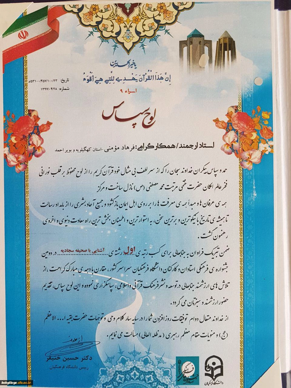 در دومین جشنواره فرهنگی کارکنان دانشگاه فرهنگیان سراسر کشور آقای مومنی به عنوان نفر اول مرحله کشوری صحیفه سجادیه برگزیده شد 2