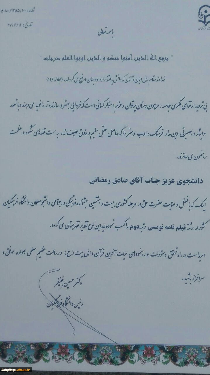 در بیست و هشتمین جشنواره فرهنگی دانشجو معلمان پسر در تهران اعلام گردید: کسب دو رتبه ممتاز برای آقایان ولید جنامی و صادق رمضانی 2