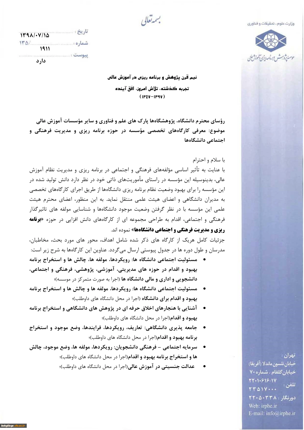 امتیاز دهید : معرفی کارگاه های مؤسسه در حوزه برنامه ریزی و مدیریت فرهنگی و اجتماعی دانشگاه ها 3 دوشنبه 22 مهر 1398 ساعت 9:33