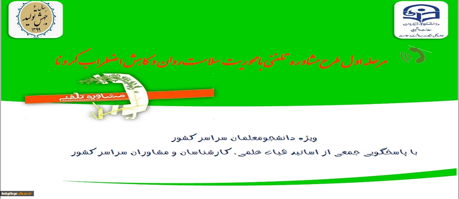 امتیاز دهید : مرحله اول طرح مشاوره تلفنی با سلامت روان و کاهش اضطراب کرونا 2 چهارشنبه 24 اردیبهشت 1399 ساعت 12:41
