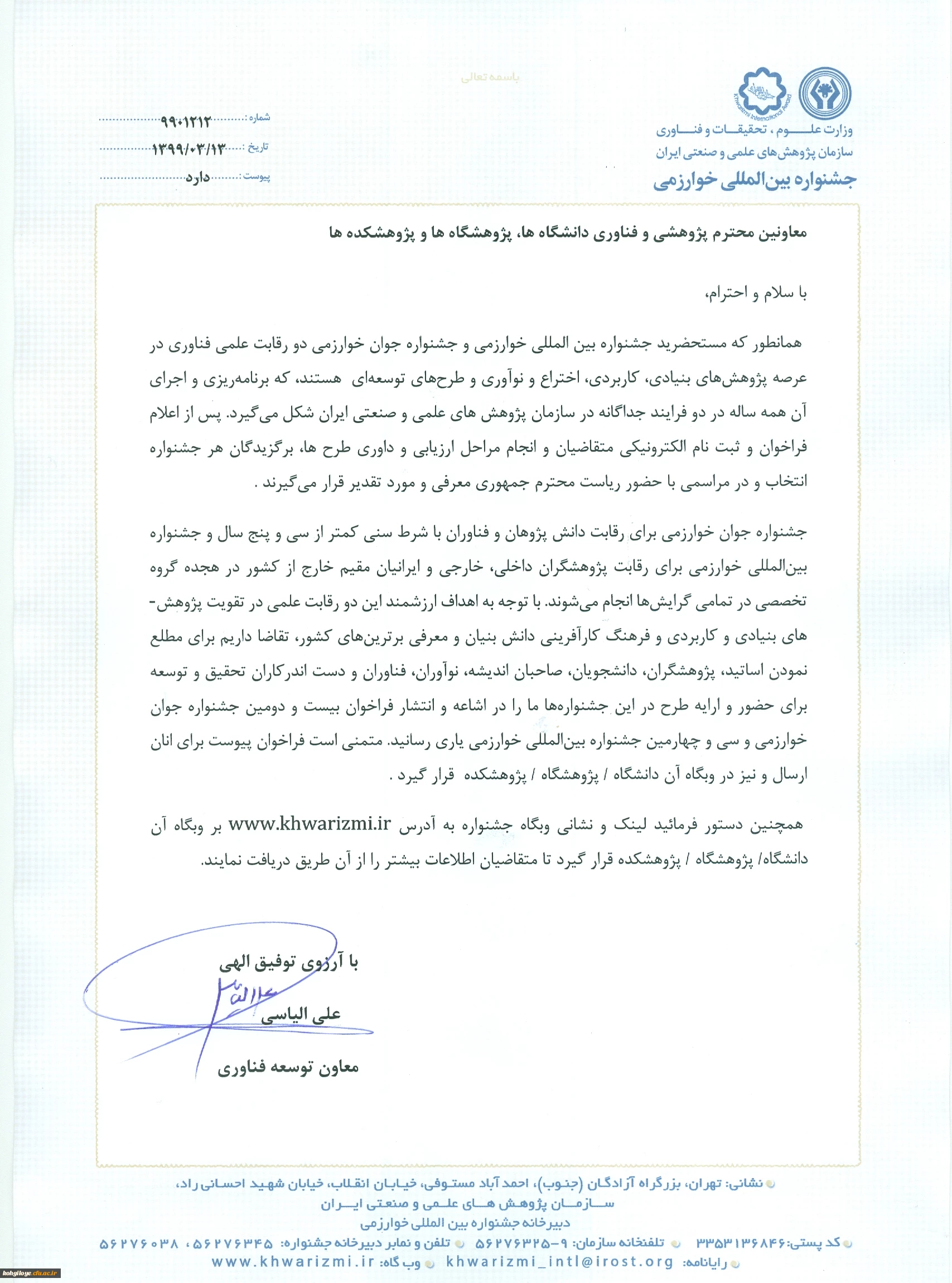 قابل توجه دانشجوان و استادان گرامی: فراخوان جشنواره بین الملی خوارزمی 2