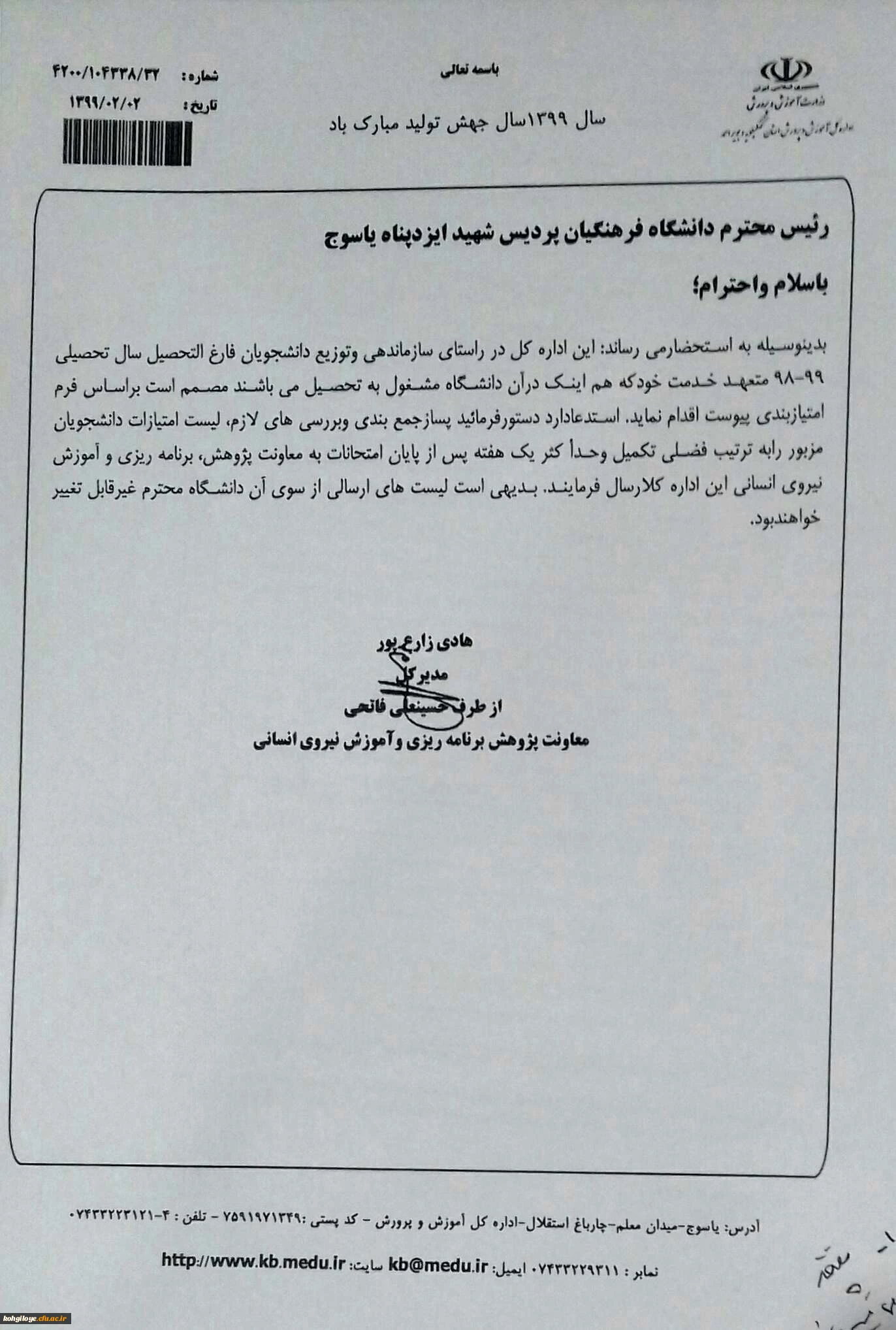 امتیاز دهید : پایان تیرماه 99، آخرین مهلت ارسال فرم امتیازبندی دانش آموختگان 3 چهارشنبه 25 تیر 1399 ساعت 10:01