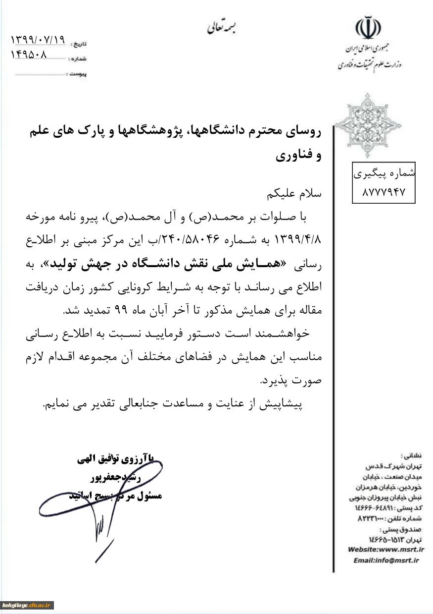 امتیاز دهید : تمدید مهلت دریافت مقله جهت همایش « نقش دانشگاه در جهش تولید» 2 چهارشنبه 30 مهر 1399 ساعت 14:25