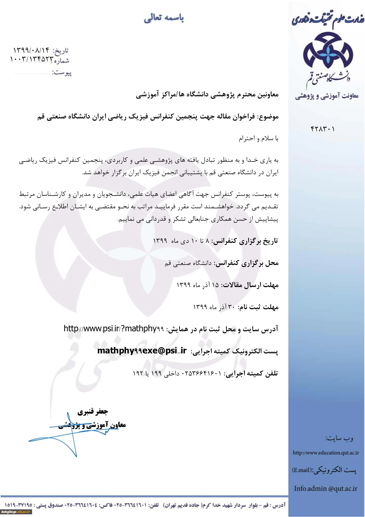 فراخوان مقاله جهت «پنجمین کنفرانس ملی فیزیک ریاضی ایران» 2