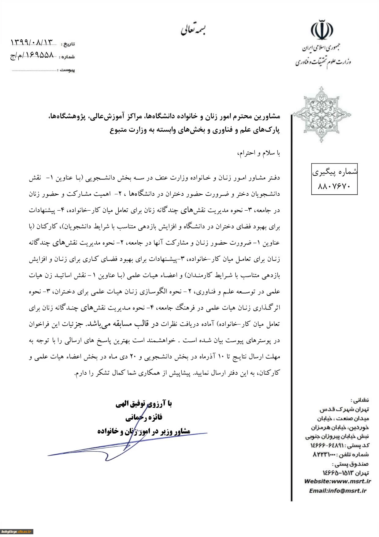 امتیاز دهید : فراخوان ارسال نظر در قالب مسابقه به دفتر مشاور امور زنان و خانواده وزارت«عتف» 6 چهارشنبه 28 آبان 1399 ساعت 14:05