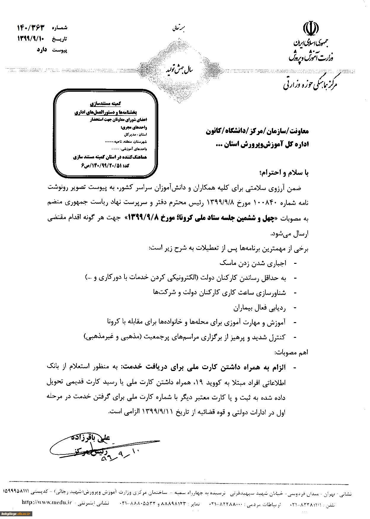 امتیاز دهید : اطلاعیه شماره13ستاد پیشگیری کنترل بیماری کرونا دانشگاه فرهنگیان 5 یکشنبه 23 آذر 1399 ساعت 14:37