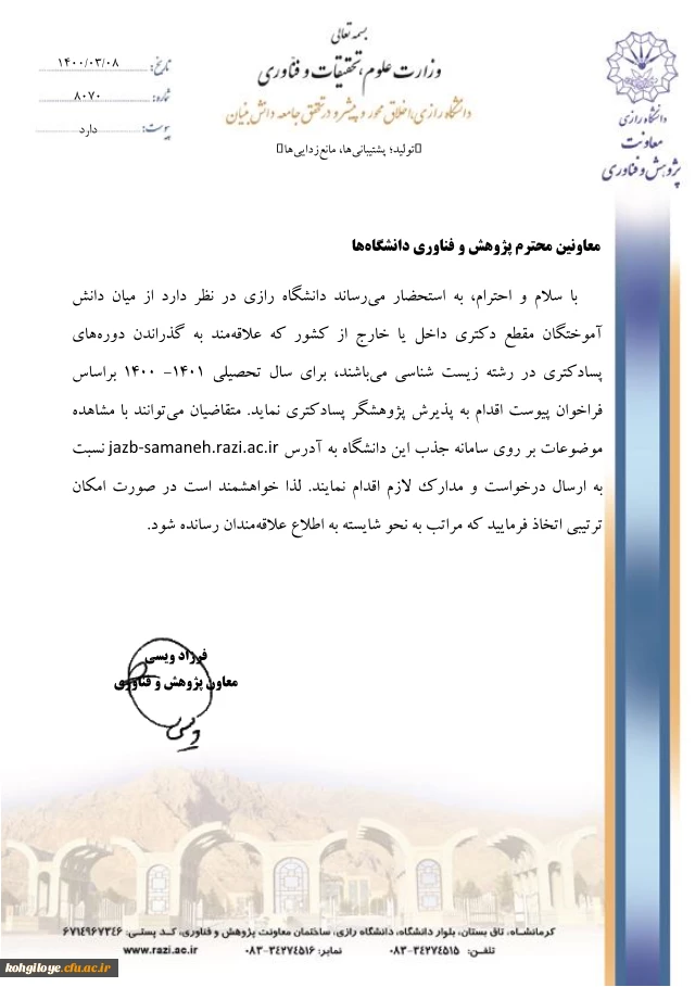 امتیاز دهید : فراخوان پذیرش پزوهشگر پسادکتری رشته زیست شناسی دانشگاه رازی در سال1400-1401 2 دوشنبه 24 خرداد 1400 ساعت 9:00