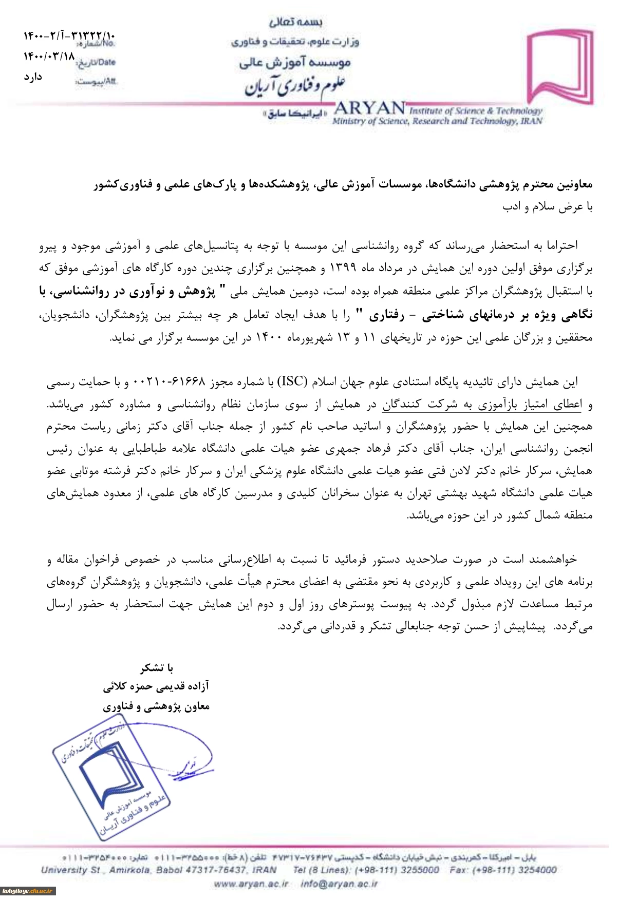 فراخوان دومین همایش ملی پژوهش و نو آوری در روان شناسی با نگاهی بر درمانهای شناختی-رفتاری 2