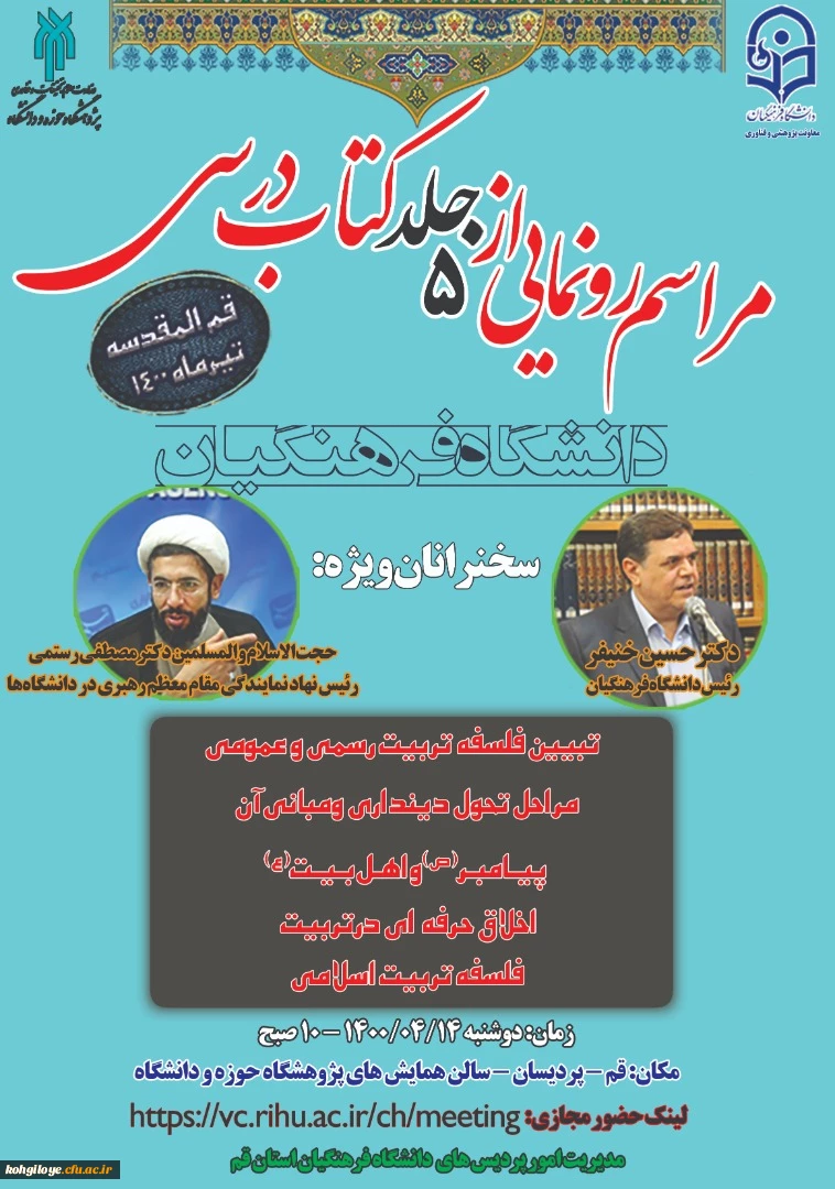 امتیاز دهید : فراخوان شرکت در مراسم رونمایی از 5 جلد کتاب درسی دانشگاه فرهنگیان 2 دوشنبه 14 تیر 1400 ساعت 12:20