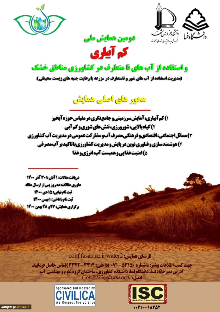 امتیاز دهید : دومین همایش ملی کم آبیاری و استفاده از آب های نامتعارف در کشاورزی مناطق خشک 2 یکشنبه 28 شهریور 1400 ساعت 9:40