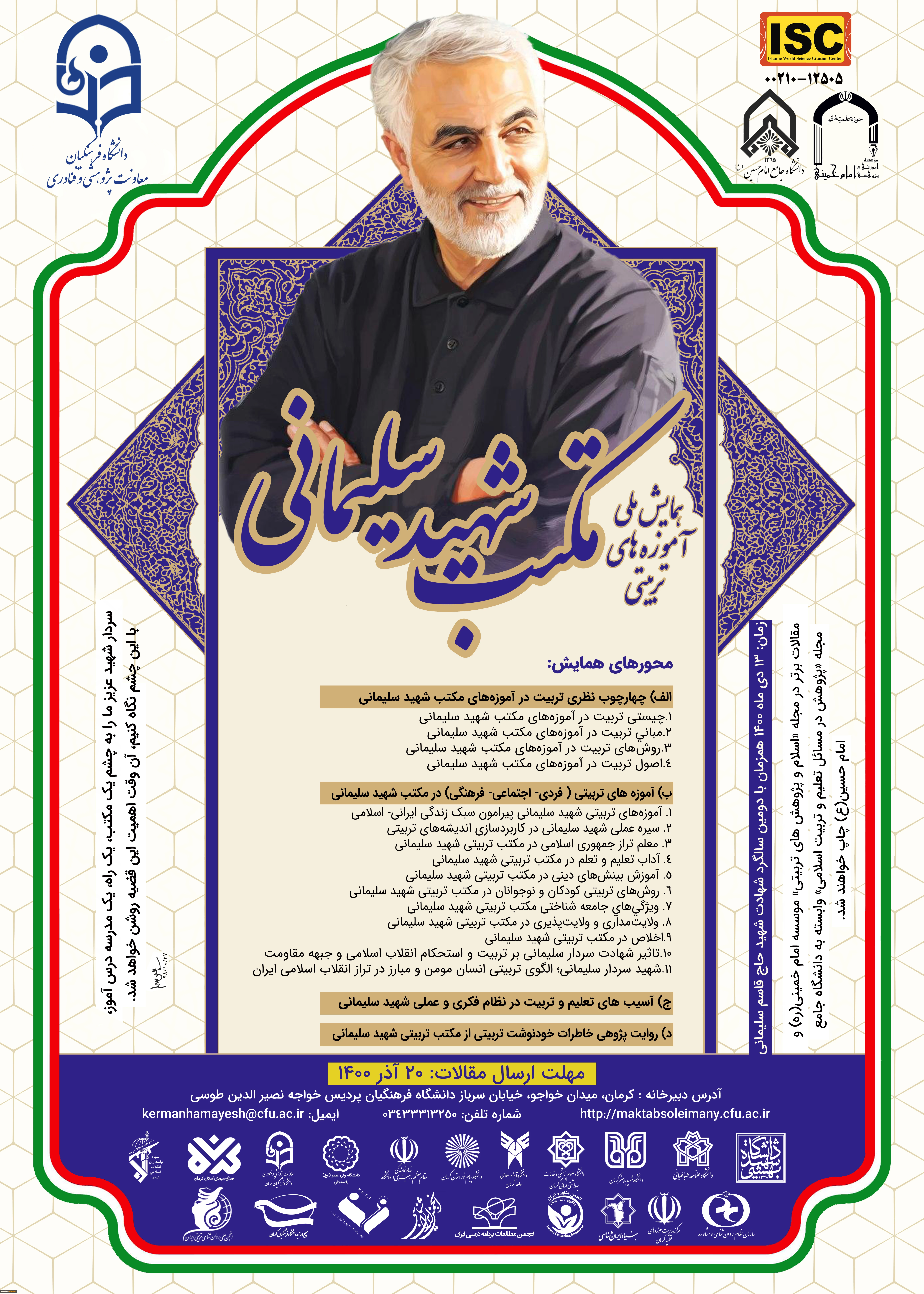 امتیاز دهید : فراخوان شرکت در همایش ملی آموزه های تربیتی مکتب شهید سلیمانی 2 شنبه 15 آبان 1400 ساعت 11:33