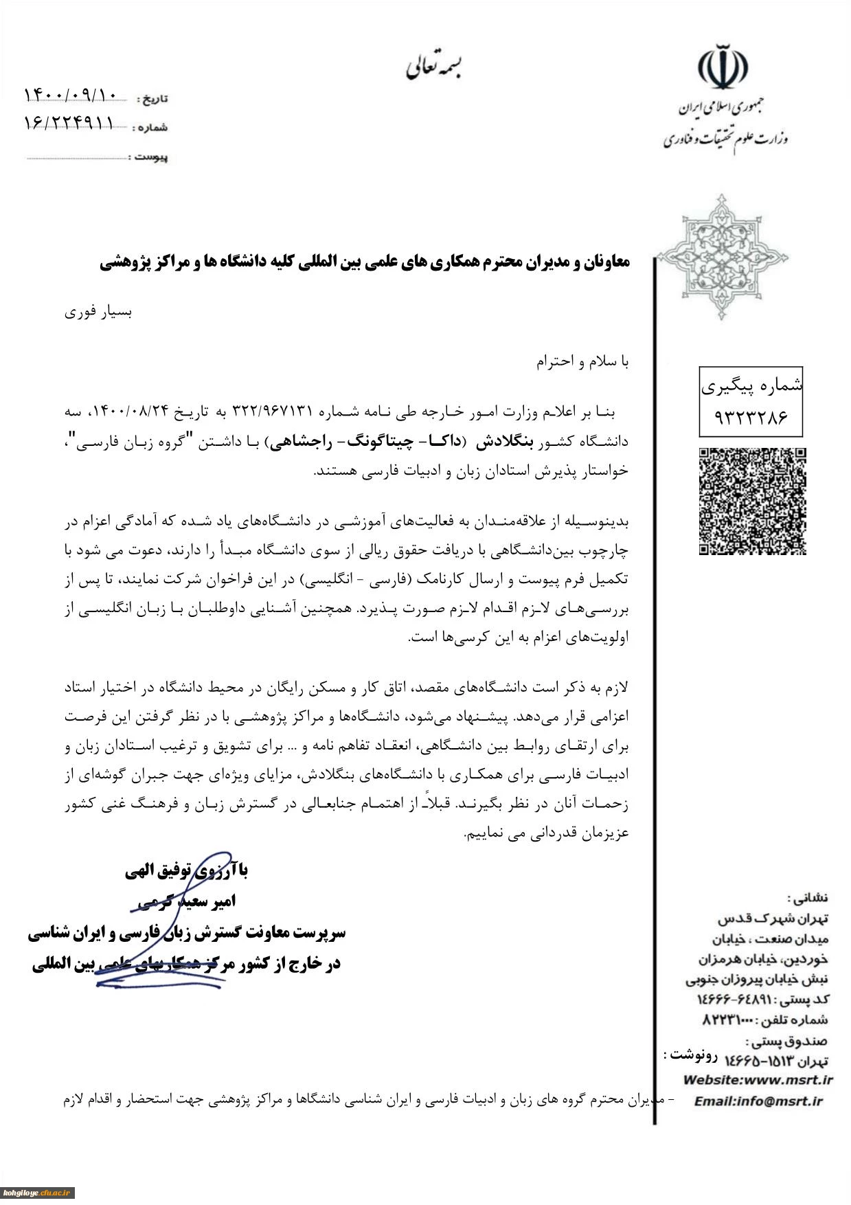 اعزام استاد زبان و ادبیات فارسی در چارچوب بین دانشگاهی به کشور بنگلادش(داکا،چیتاگونگ و راجشاهی) 2