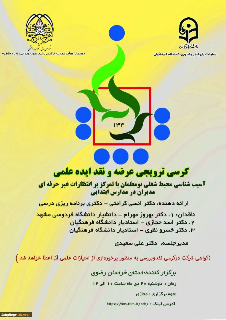 برگزاری کرسی ترویجی عرضه و نقد ایده علمیبا عنوان: آسیب شناسی محیط علمی نو معلمان با تمرکز بر انتظارات غیرحرفه ای مدیران در مدارس ابتدایی 2