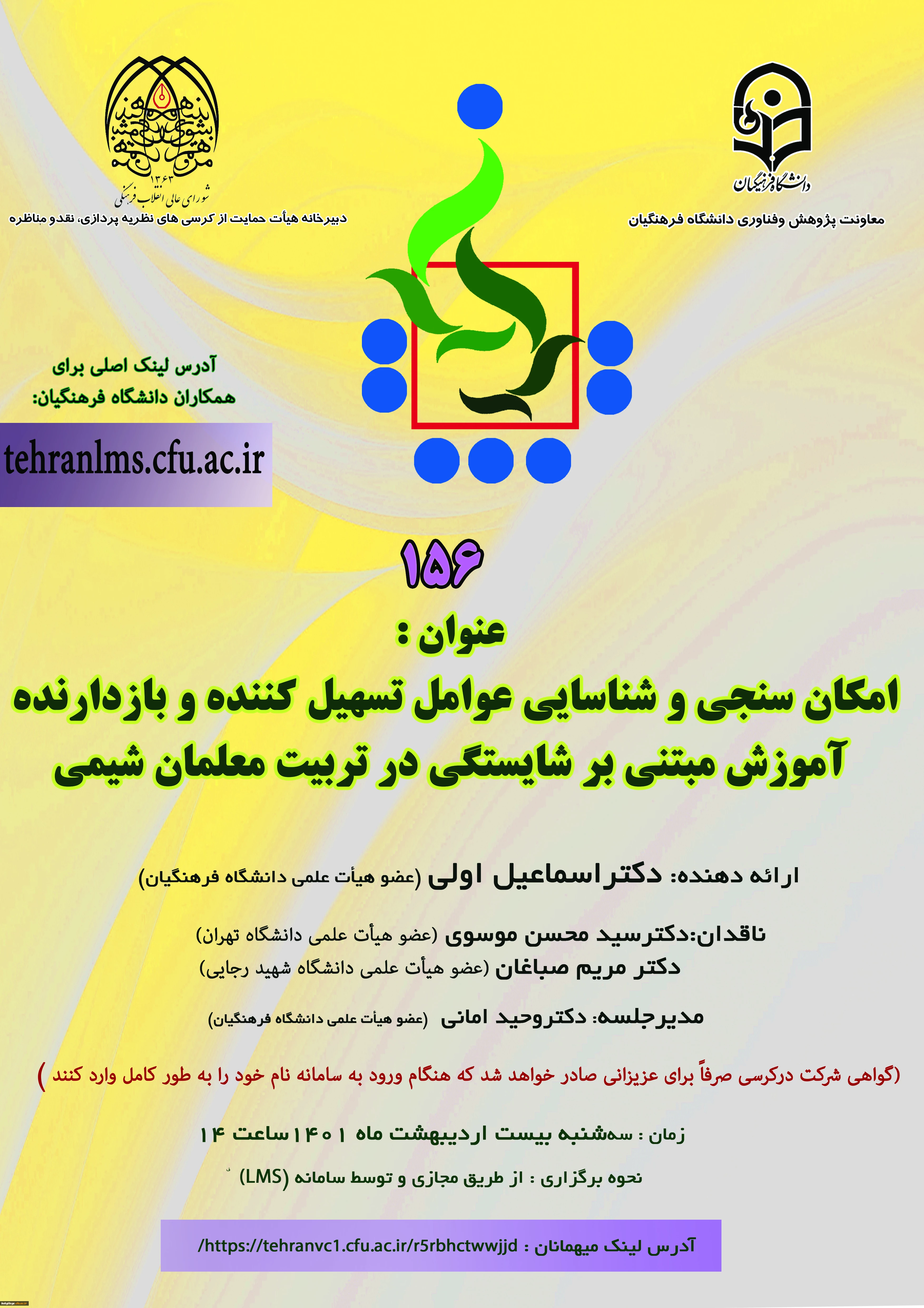 قابل توجه اعضای محترم هیأت علمی، دانشجومعلمان، کارکنان و سایر علاقه مندان: برگزاری کرسی علمی- ترویجی 156 با عنوان « امکان سنجی و شناسایی عوامل تسهیل کننده و بازدارنده آموزش مبتنی بر شایستگی در تربیت معلمان شیمی» 2