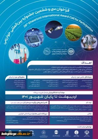 امتیاز دهید : فراخوان 36مین دوره جشنواره بین المللی خوارزمی و 24مین جشنواره جوان خوارزمی 2 چهارشنبه 11 خرداد 1401 ساعت 7:48
