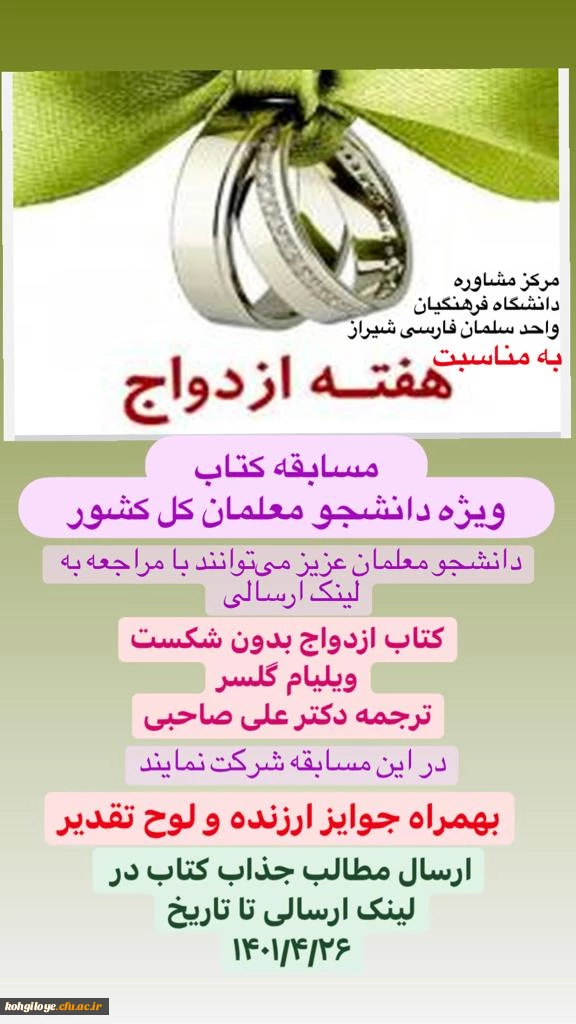 امتیاز دهید : برگزاری مسابقه ویژه کل دانشجومعلمان کشور به مناسبت هفته ازدواج 3 سهشنبه 14 تیر 1401 ساعت 8:35
