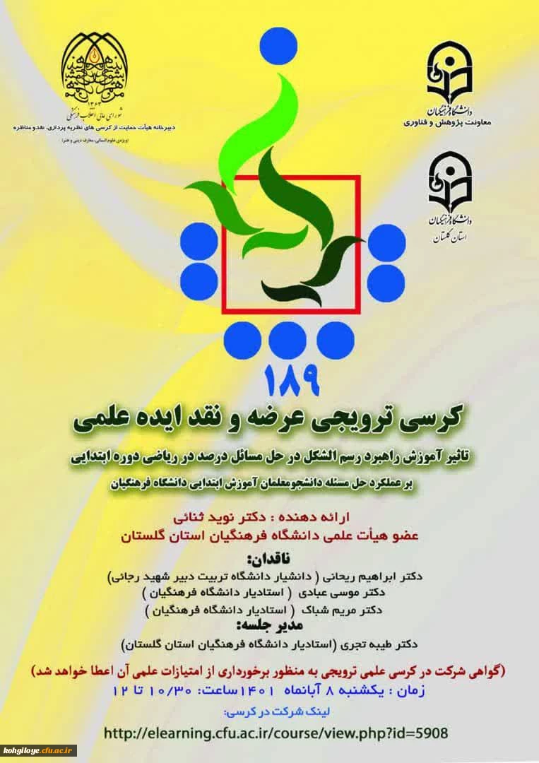 برگزاری کرسی ترویجی تأثیر آموزش راهبرد رسم شکل در حل مسائل درصد در ریاضی دوره ابتدایی بر عملکرد حل مسئله دانشجو معلمان آموزش ابتدایی دانشگاه فرهنگیان 2